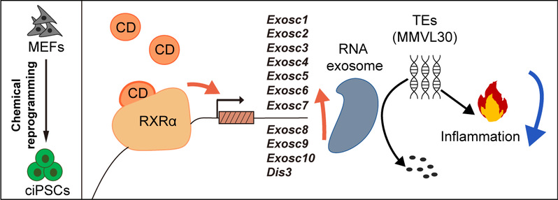 为解决效率低和机制不清晰等问题,本研究首先通过开展化学小分子文库筛选,发现一个新的小分子CD3254通过激活内源转录因子RXRα,显著提高细胞化学重编程效率。通过一系列实验证明CD3254处理获得的化学诱导多能干细胞具备多能性,能够分化成三个胚层细胞和组织,将ciPSCs打到小鼠胚胎,能够获得健康的小鼠。进一步的机制研究揭示,CD3254-RXRα能够直接转录激活RNA外切体(RNA exosome)的所有11个基因(Exosc1-10Dis3),而且相关功能实验也证明RNA外切体在细胞重编程过程中是必不可少。有意思的是,在重编程过程中RNA 外切体能够降解转座子相关RNAs,其中多数转座子属于MMVL30家族;进一步功能实验表明MMVL30是细胞化学重编程的一个新障碍,其敲低可以促进细胞重编程效率;重要的是,CD3254-RXRα-RNA外切体这一信号轴可以通过降解MMVL30转座子相关RNAs,减少细胞内双链RNAs的形成,减弱双链RNAs引发的细胞炎症反应(包括IFN-γTNF-α等通路),从而有效促进细胞重编程。