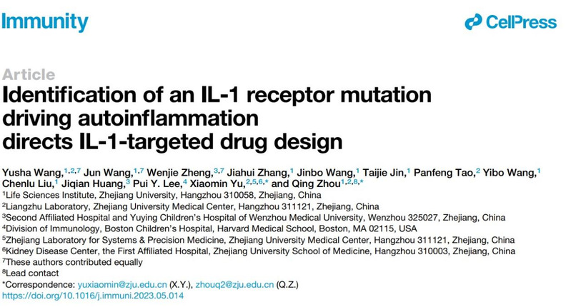 2023年6月13日周青实验室合作发现IL-1R1突变导致的新自身炎症性疾病LIRSA并开发出靶向IL-1的新药物Rilabnacept