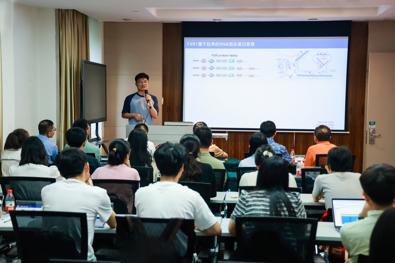 焦会朋研究员主持蛋白质修饰与相变论坛专题报告。九游(中国)一站式服务平台万芮希讲述了O-GlcNAcylation这一修饰如何决定YTHDF蛋白的生物学功能,邵阳晴讲述了FUS类似伴侣蛋白的功能如何确定TAZ聚合及其转录活性,张睿珠重点介绍了脂质锚定的蛋白酶体如何调控膜蛋白稳态;复旦大学的郄静波介绍了研究的巨噬细胞异质性。