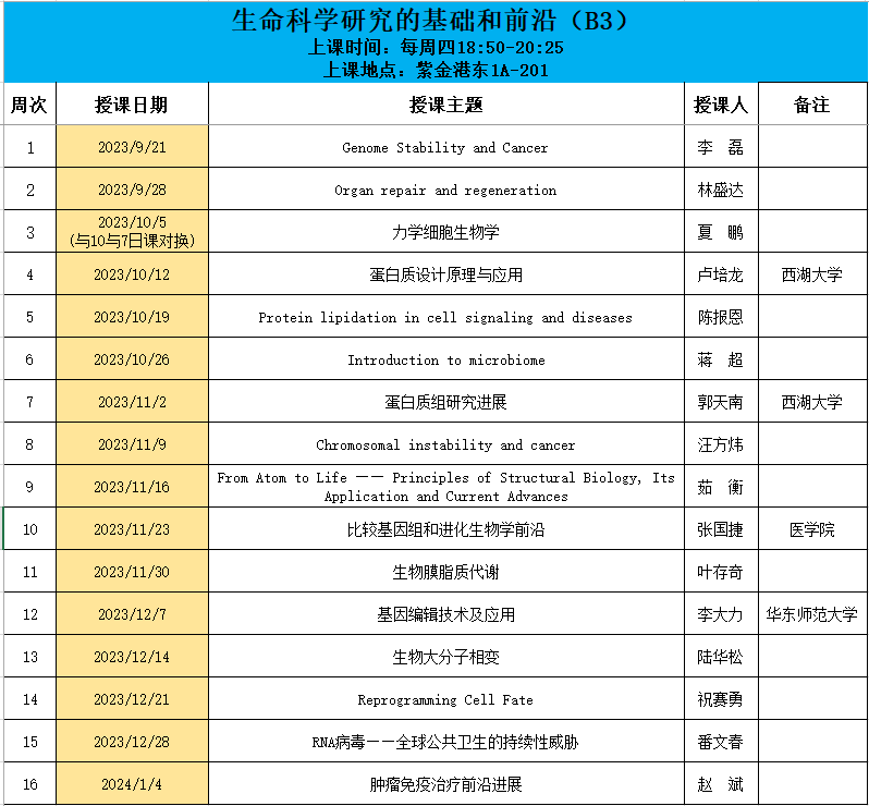 2023-2024年“生命科学研究的基础和前沿”课程安排