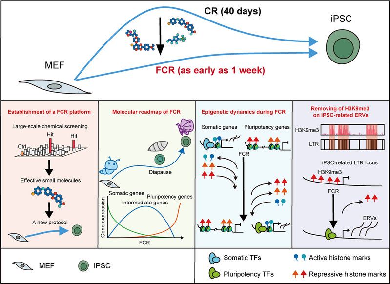 202387日,我院祝赛勇实验室在Nature Cell Biology发表题为“A fast chemical reprogramming system promotes cell identity transition through a diapause-like state”的研究论文,道了细胞快速化学重编程(Fast chemical reprogramming, FCR)。该研究中作者综合运用多种策略,筛选20000多个条件,自主研发创建了FCR,大幅度加快了细胞命运重塑进程,将原先约40天的过程缩短至7-12在此基础上,利用多组学测序及整合分析,系统描绘了FCR过程转录与表观遗传动态,并揭示FCR后期经历一个独特的滞育类似状态有意思的是,作者还发现异染色质组蛋白修饰H3K9me3通过调控多能性相关ERVs从而为重编程障碍的独特机制。