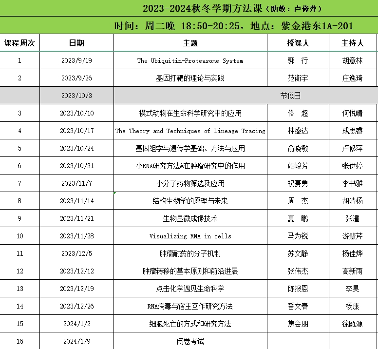 2023-2024年“生命科学研究方法学”课程安排