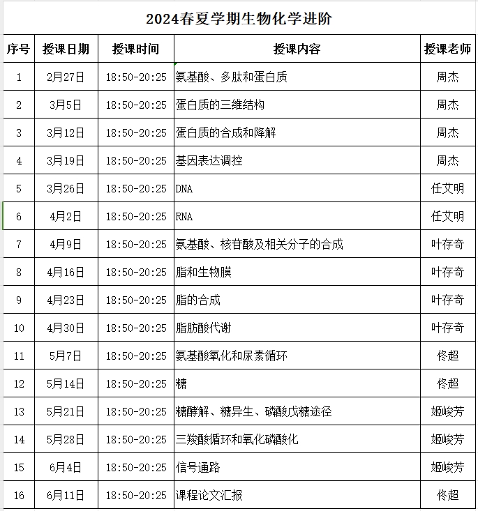 2024年“生物化学进阶”课程安排