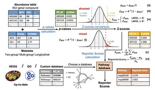 功能富集分析是一种主流的生物信息学分析方法,有助于了解大型组学数据集(如转录组、宏基因组和代谢组数据)的生物学意义。我们可以通过识别丰富的功能类别(例如GO或KEGG pathway)来深入了解潜在的生物学过程和功能,并为下游实验提供假设。然而,大多数现有工具无法直接将富集分析应用于多群组(Multi-group)和纵向(Longitudinal)组学数据。基于Reporter Score的富集分析(RSA)方法显示出卓越的敏感性,因为它依赖于p值而不是特征原始值,但由于缺乏适当的工具经常被误用。