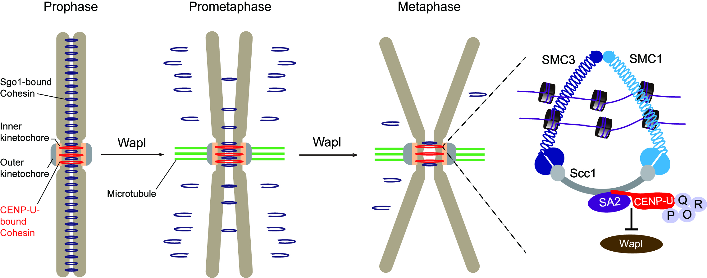 功能研究发现,将CENP-UFDF基序突变为ADA后,不仅破坏了CENP-OPQUR复合体与黏连蛋白复合体的结合,还使得姐妹染色单体黏连变弱。机理研究发现,敲低黏连蛋白的调节亚基Wapl使得姐妹染色单体黏连不再依赖于CENP-U,不能结合CENP-UScc1-SA2突变体也部分失去了结合Wapl的能力,而且CENP-U能竞争性地排斥Wapl结合Scc1-SA2亚复合物,说明CENP-U通过抑制Wapl的功能促进姐妹染色单体黏连。