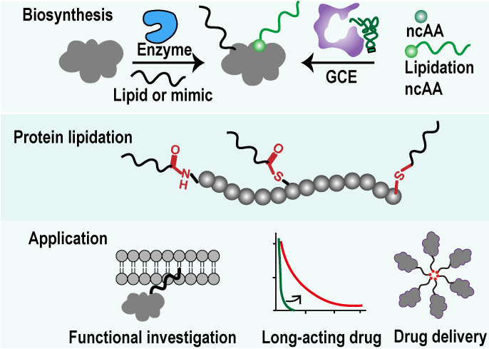 脂化修饰通过将强疏水性的脂质分子共价连接到蛋白质的特定位点上,从而重塑蛋白质与膜,蛋白质与蛋白质的相互作用。在所有与膜相关的生物学过程中, 蛋白质脂化修饰几乎都发挥着重要作用。虽然细胞中有上千种蛋白质存在脂化修饰,但由于脂化修饰的高度可变、可逆以及与其它翻译后修饰串扰的特点,大多数蛋白质上脂化修饰的功能仍不明确。同时,脂化修饰的多肽或蛋白质药物通过结合血清白蛋白,显著延长了药物的血清半衰期。脂化修饰是经临床证实的长效药物的重要开发策略,已被成功地应用于多个重磅上市药物的开发,如索马鲁肽和替尔泊肽。因此,对蛋白质脂化修饰合成生物学的探索,既有助于研究脂化修饰的分子机制和生物学功能,又能够为新型脂化修饰药物的设计和制造提供策略。