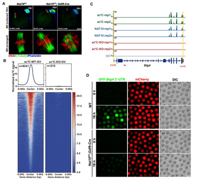 2Nat10条敲小鼠卵母细胞中母源mRNAac4C修饰降低并导致翻译效率显著降低A: Nat10缺失造成严重的减数分裂成熟缺陷。Bac4C LACE-seq结果显示Nat10缺失后整体ac4C修饰水平显著降低C关键母源基因Btg4 mRNAac4C修饰信号在Nat10条敲小鼠卵母细胞中几乎完全消失。DNat10条敲小鼠卵母细胞成熟过程中GFP-Btg4 3’-UTR 报告载体翻译活性显著降低