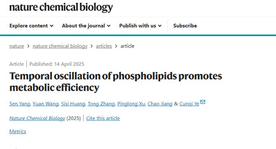 2025年4月14日,我院叶存奇团队取得一项重大突破,首次证实了真核细胞存在内源性磷脂合成节律,解析了不同甘油磷脂分子的相位特异性振荡特征,以影响膜流动性,并进一步阐明了驱动该振荡节律的关键调控机制。这项研究不仅揭示了细胞关键物质通过自调控系统影响熵变应对能量代谢的时间机制,更为我们理解细胞节律、生物膜演化、细胞对环境感受及响应机制提供了全新的视角。相关研究成果于2025年4月14日以题为Temporal oscillation of phospholipids promotes metabolic efficiency在《Nature Chemical Biology》期刊上在线发表。