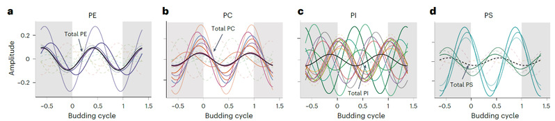 其二,借助创新性设计的同位素脂质追踪与反向追踪技术,研究团队证实磷脂PE与PC细胞含量的周期性振荡依赖于TAG作为关键的脂质存储库进行生物合成转化,而PI与PS则主要通过从头合成途径进行。