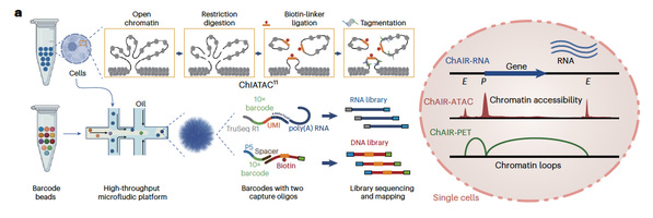 为了填补当前的技术空缺,我院阮一骏实验室在前期开发了能在群体细胞水平同时检测染色质相互作用以及染色质开放性的技术ChIATAC[1]。在此基础之上,课题组进一步开发出了具有单细胞多组学分辨率的新技术ChAIR[2]