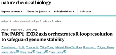 2025年6月27日,我院黄俊教授团队在Nature Chemical Biology杂志在线发表了题为The PARP1–EXD2 axis orchestrates R-loop resolution to safeguard genome stability的研究成果,系统揭示了3'–5'核酸外切酶EXD2是PARP1去除R-loop的关键下游效应因子,为阐明PARP1调控R-loop稳态及缓解TRCs的机制提供了重要支撑。