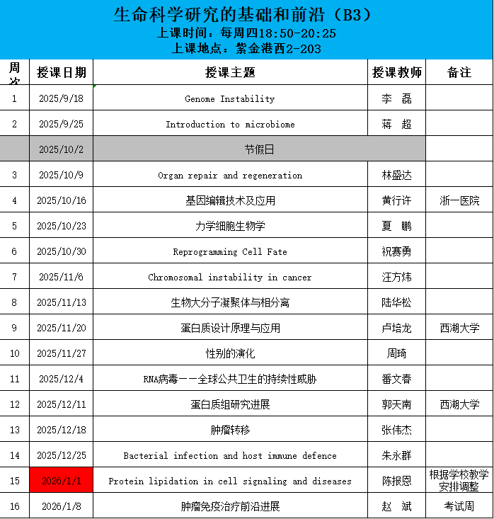2025-2026年“生命科学研究的基础和前沿”课程安排