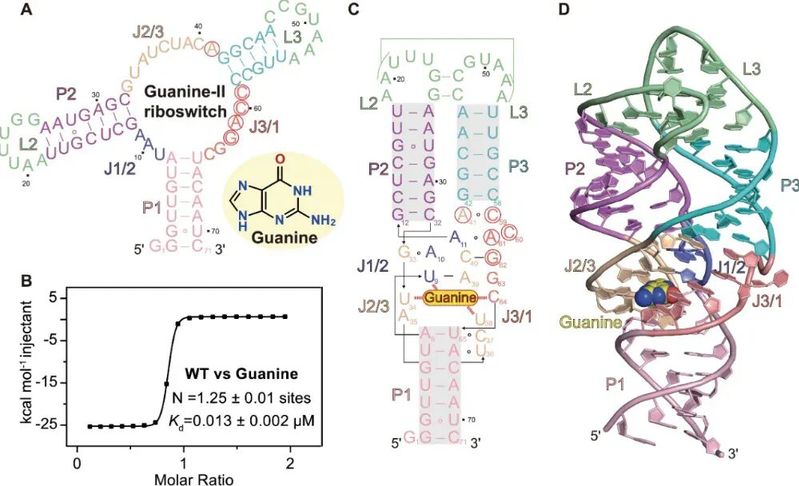 图1. 鸟嘌呤-II 核开关的二级和三级结构