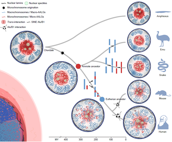 染色体不仅是遗传信息的线性载体,其在细胞核内的三维空间上的折叠和排布(3D Genome)对基因调控至关重要。羊膜动物(包括哺乳类、鸟类、爬行类)在漫长的演化过程中,其染色体发生了怎样的断裂、融合与重排?这种线性的剧烈变化如何改变染色体在细胞核内的三维空间位置和构象?