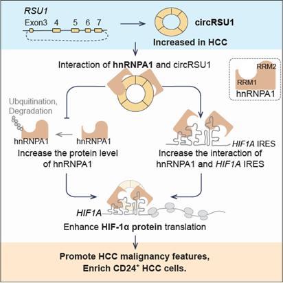 通过对肝癌患者环状RNA表达谱的分析及肝癌细胞的功能筛选,鉴定到circRSU1是最为重要的候选circRNA:在病人肝癌组织中表达显著高于癌旁组织;可明显促进肝癌的恶性表型,尤其增加CD24 阳性肝肿瘤干细胞群体的比例。进而通过一系列的细胞、分子生物学和实验动物学方法,系统揭示:1)circRSU1 在肝癌中表达上调,在体内外可促进肿瘤恶性表型,并增加 CD24 阳性肿瘤干细胞比例;2)circRSU1 依靠自身两个RNA基序与hnRNPA1蛋白的两个RNA结合结构域相结合发挥作用;3)circRSU1 通过抑制泛素化降解,稳定hnRNPA1蛋白并提高其表达水平;4)hnRNPA1结合HIF1A的IRES区域,促进HIF‑1α蛋白翻译,进而增加CD24阳性细胞比例;5)同时,circRSU1还可以显著增强 hnRNPA1 与 HIF1A IRES 的相互作用,进一步促进了HIF‑1α的翻译。