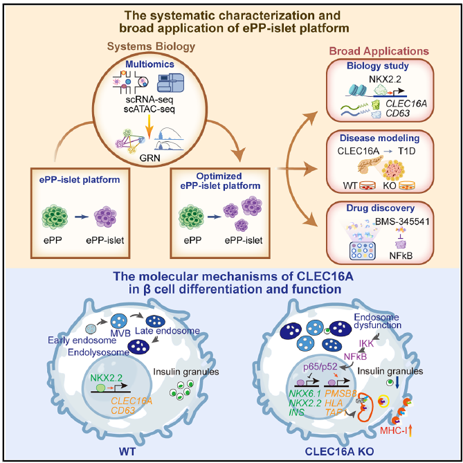 近日,我院祝赛勇实验室与浙江大学附属儿童医院傅君芬实验室合作Cell Reports上发表“Single-cell multi-omic analyses highlight the essential role of NKX2.2-CLEC16A/endosomal pathway for human pancreatic differentiation and function”的研究论文,利用实验室近期自主构建的可扩增胰岛前体细胞分化胰岛体系(ePP-islet),系统揭了干细胞向胰岛分化过程中转录与染色质开放动态变化并鉴定出NKX2.2-CLEC16A/内体通路这一调控轴在胰岛分化的关键作用。进一步研究发现CLEC16A敲除模型呈现高免疫原性特征,为I型糖尿病模型构建提供了新策略;同时,基于ePP-islet系统开展的药物筛选鉴定出IKK抑制剂可有效恢复CLEC16A缺失表型,为后续转化研究提供了重要思路(图1
