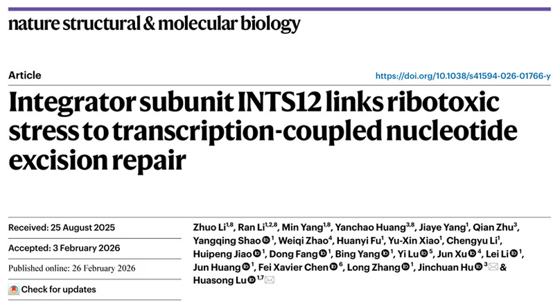 2026年2月26日陆华松实验室在Nature Structural & Molecular Biology发文揭示INTS12感受RNA损伤信号促进DNA修复的分子机制