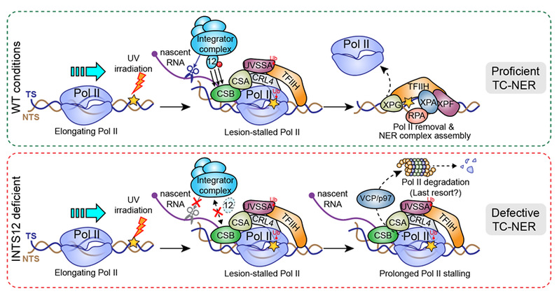 综上,该研究系统揭示了一条从RNA损伤到DNA修复启动的完整信号通路。这一机制恰如“矿井中的金丝雀”(Canary in the coal mine)。由于金丝雀对有毒气体高度敏感,旧时煤矿工人常携带其下井,用于指示危险“前兆”。在细胞中,紫外线诱导的RSR,如同最先感知并发出预警的金丝雀,将损伤信号传递至细胞核。随后,INTS12发生磷酸化修饰,进而招募Integrator复合物至停滞的Pol II,促进TC-NER修复过程,从而在基因毒性胁迫下维护基因组完整性(图1)。这些发现深化了我们对RNA损伤信号与DNA修复通路之间耦联机制的理解。
