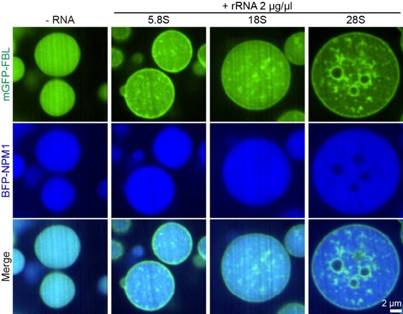 图2. NPM1-FBL凝聚体分别加入人源5.8S、18S或28S rRNA后的共聚焦成像。