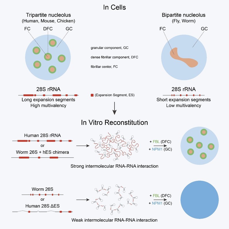 来自三层核仁物种(人、小鼠、鸡)的28S rRNA具有更长的扩展片段和更强的多价性,能够诱导DFC-like结构;而来自两层核仁物种(果蝇、线虫)的28S/26S rRNA则不能。嵌合RNA实验提供了最直接的证据:将人源ES7、ES15和ES27插入线虫26S rRNA后赋予其诱导DFC-like结构的能力;反之,删除人源28S rRNA的这些扩展片段则导致该能力丧失。