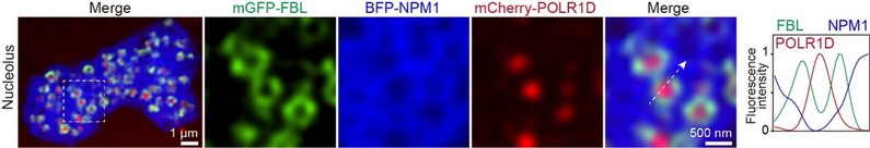 图1. DFC(FBL)、GC(NPM1)和FC(POLR1D)荧光标记的HeLa细胞核仁活细胞成像。