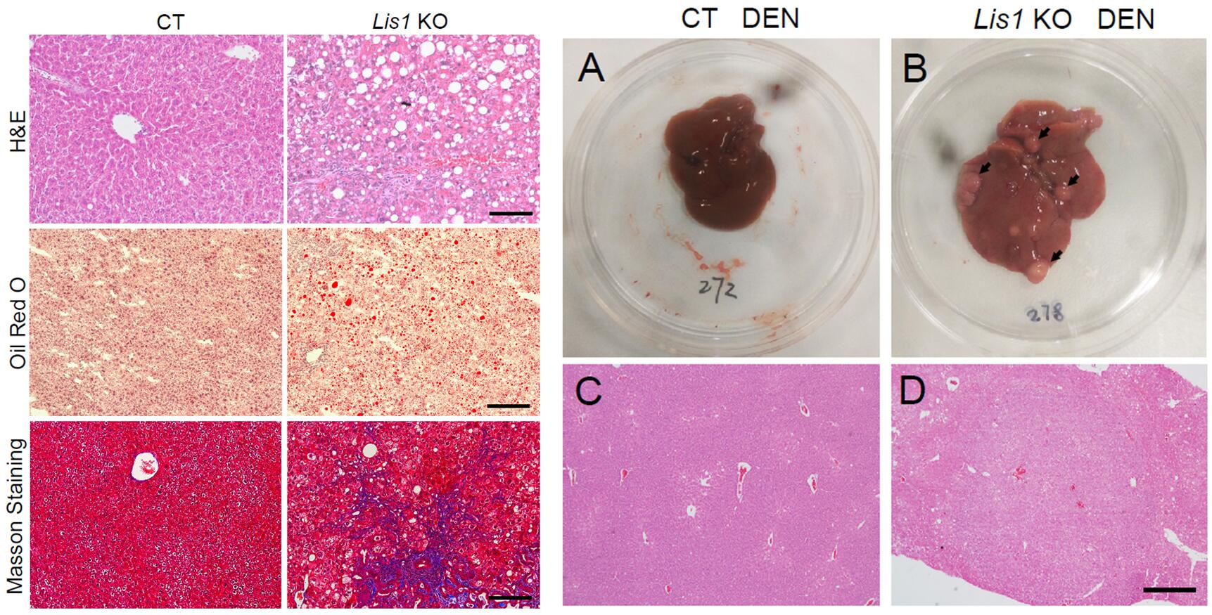 Left: Increased lipids and fibrosis are observed in Lis1 KO livers.