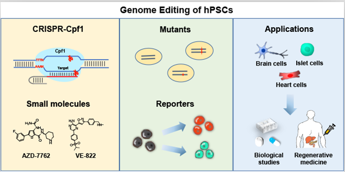 Human pluripotent stem cells (hPSCs) have potential applications in biological studies and regenerative medicine. However, precise genome editing in hPSCs remains time-consuming and labor-intensive. The unique properties of CRISPR-Cpf1, including shorter crRNA length and low off-target activity, are very attractive for many applications.This paper demonstrates that the recently identified CRISPR-Cpf1 can be used to efficiently generate knockout and knockin hPSC lines. Particularly, Dr. Zhu’s group developed an unbiased drug-selection based platform feasible for high throughput screening in hPSCs and this screening system enabled them to identify small molecules VE-822 and AZD-7762that could promote CRISPR-Cpf1 mediated precise genome editing. Significantly, the combination of CRISPR-Cpf1 and small molecules holds great potentials in many applications, including disease modeling, drug discovery, and regenerative medicine.