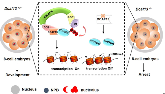 Theyreport DCAF13 as a novel CRL4 adaptor is a highly expressed zygotic gene inboth murine and human embryos. Dcaf13 knockout murine embryos are arrested at the morula stage, accompanied withdecreased activities of rDNA transcription in eight-cell embryos. Furthermore,the overexpression of SUV39H1 in embryos mimics the phenotype of Dcaf13 knockout embryos. Consistently,biochemical assays show that DCAF13 bridges CRL4 E3 ubiquitin ligase to targetSUV39H1 for polyubiquitination and proteasomal degradation, and thereforefacilitates H3K9me3 removal and zygotic gene expression from eight-cell stage.These results indicate a novel factor for maintaining preimplantation embryonicdevelopment, and reveal underlying molecular mechanisms of preimplantationembryonic efficient reprogramming.