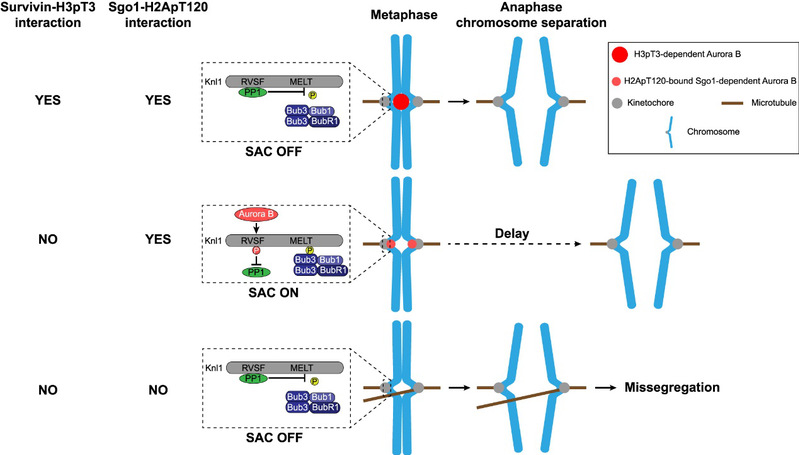 Figure. Model for the role of H3pT3- and H2ApT120-dependent localization of Aurora B at centromeres in regulating kinetochore function and chromosome segregation.