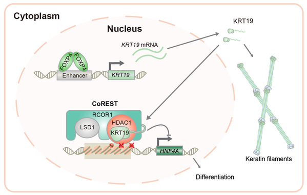 Using multiplexed genome editing of hepatocytes in vivo, Prof. Zhao’s group demonstrated that KRT19 promoted liver tumorigenesis in mice. Cell fractionation revealed a previously unrecognized nuclear fraction of KRT19. Tandem affinity purification identified histone deacetylase 1 (HDAC1) and REST co-repressor 1 (RCOR1), components of the co-repressor of RE-1 silencing transcription factor (CoREST) complex as KRT19-interacting proteins. KRT19 knockout markedly enhanced histone acetylation levels. Mechanistically, KRT19 promotes CoREST complex formation by enhancing HDAC1 and RCOR1 interaction, thus increases the deacetylase activity. ChIP-seq revealed hepatocyte-specific genes, such as hepatocyte nuclear factor 4 alpha (HNF4A), as direct targets of KRT19-CoREST. In addition, they identified forkhead box P4 (FOXP4) as a direct activator of aberrant KRT19 expression in liver cancer. Furthermore, treatment of primary liver tumors and patient-derived xenografts in mice suggest that KRT19 expression has the potential to predict response to HDAC inhibitors especially in combination with Lenvatinib.