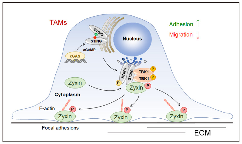 This study first revealed that, beyond its traditional role in pathogen detection and immune activation, nucleic acid sensing also regulated macrophage adhesion and motility. Understanding TBK1-Zyxin signaling and its effect on tumor-associated macrophage infiltration and antitumor immunity would provide new therapeutic targets and theoretical foundations for developing cancer immunotherapies.