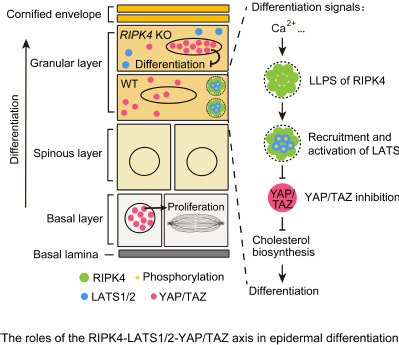 On June 25, 2025, the laboratory of Professor Bin Zhao at our institute published a research article titled RIPK4 promotes epidermal differentiation through phase separation and activation of LATS1/2 online in Developmental Cell. Using tools such as skin organoids, knockout and knockin mice, this work elucidates the regulatory mechanism of the RIPK4-initiated non-canonical Hippo pathway in epidermal differentiation and reveals the role of phase separation in cell differentiation.