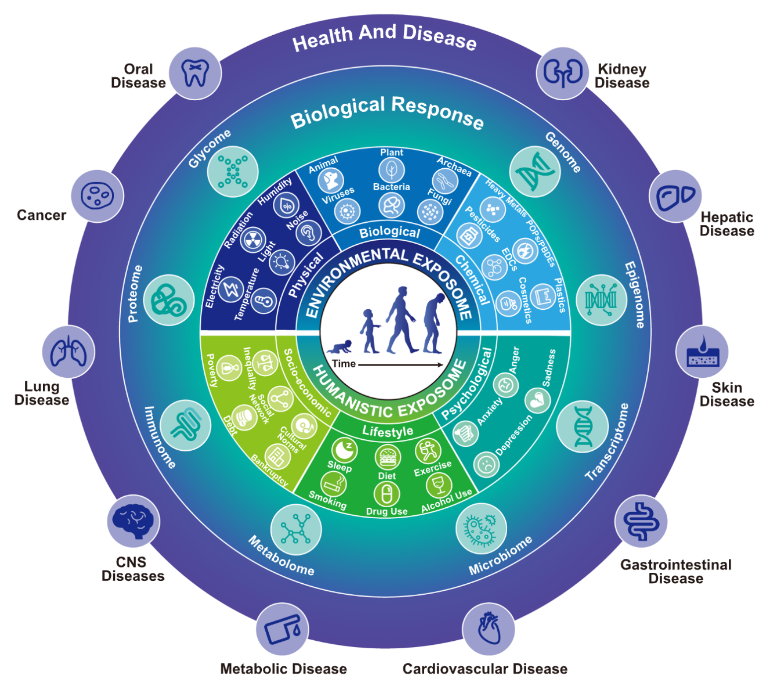 We are continuously exposing to a dynamic and vast collection of environmental exposures everyday, all of which have the potential to directly or indirectly impact our health or even daily activities. Specifically, biological and chemical exposures from air, water, soil, food, and the commensal microbial communities living on and inside us, along with their metabolites, can directly influence our health and disease status. Some of these exposures have been widely recognized, such as the consequences of long-term smoking and drinking. However, due to various reasons, the complexity of these environmental exposures is so far largely understudied, and a systematic view of the spatial-temporal dynamics of these exposures have yet to be achieved. The consequeces of these emerging exposures on human health are still unknown.