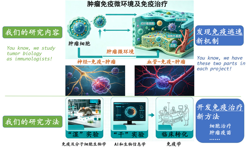 免疫治疗虽已革新肿瘤治疗模式,但仍面临响应率低和疗效难以持久等多重挑战。实验室致力于探索肿瘤微环境和解析免疫记忆形成的关键机制。基于“神经-免疫-肿瘤”和“血管-免疫-肿瘤”轴,利用“干湿实验结合”方法,发现新的免疫调节机制和分子靶点,以此开发新的免疫治疗策略,包括细胞治疗、细胞因子治疗和肿瘤疫苗等,以提升治疗响应率并实现长期疗效维持。