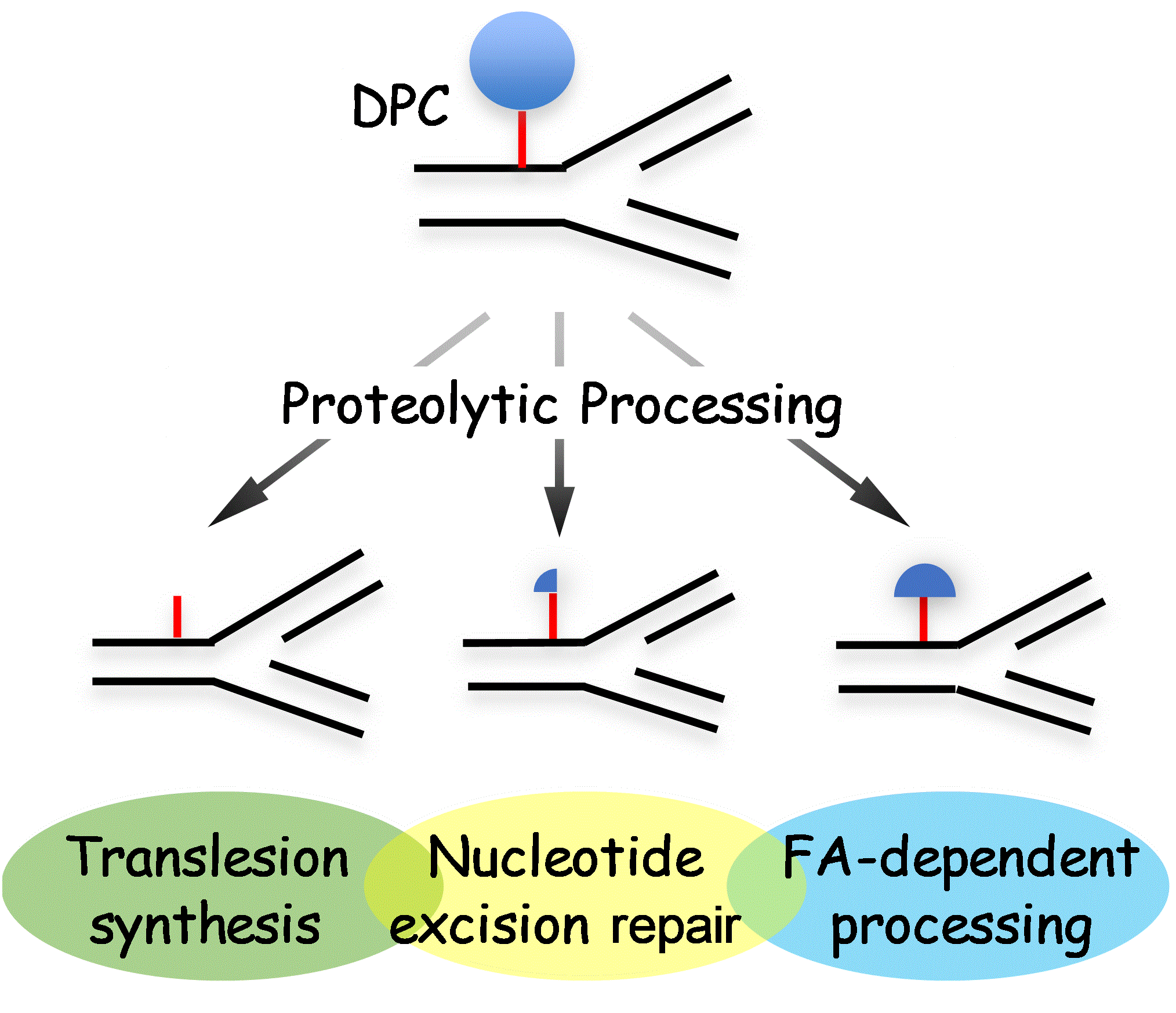 其他类型的DNA损伤相比,DPC的特征是蛋白质加合体的庞大性。导致蛋白因子功能在DPC损伤识别和修复过程中面临严重的空间阻碍。在细胞中,这一阻碍可以通过蛋白酶体或蛋白酶降解来减小蛋白加合物体积,将DPC上的蛋白转化为短肽加合物。短肽-DNA交联可能是NER(核酸剪切修复)通路的底物,也可由跨损伤DNA合成的途径保证DNA复制的连续性。另一方面,较大的蛋白酶解中间体,例如三级结构仍然保持的蛋白酶解中间产物,依旧对DNA转录及复制形成较强的阻碍,需要FA通路来清除。我们的工作将以DPC形成和修复机制作为主要目标之一.