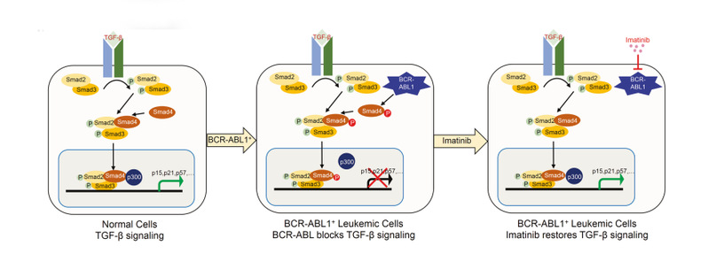 TGF-β介导的生长抑制的丧失是癌症发展的主要原因,最典型的例子是结直肠癌和胰腺癌中编码TGF-β信号通路成分的基因的功能缺失突变。或者,功能获得癌基因突变也会破坏抗增殖TGF-β信号传导。然而,致癌基因诱导的TGF-β信号传导调控的分子机制尚未得到广泛研究。本研究发现慢性粒细胞白血病(CML)的致癌BCR-ABL1和细胞ABL1酪氨酸激酶磷酸化并失活Smad4,以阻断抗增殖TGF-β信号传导。
