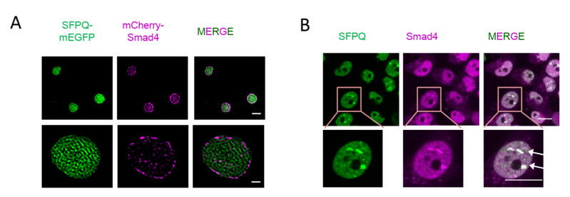 图 1 SFPQ凝聚体在分子(A)和细胞(B)水平滞留抑癌蛋白Smad4